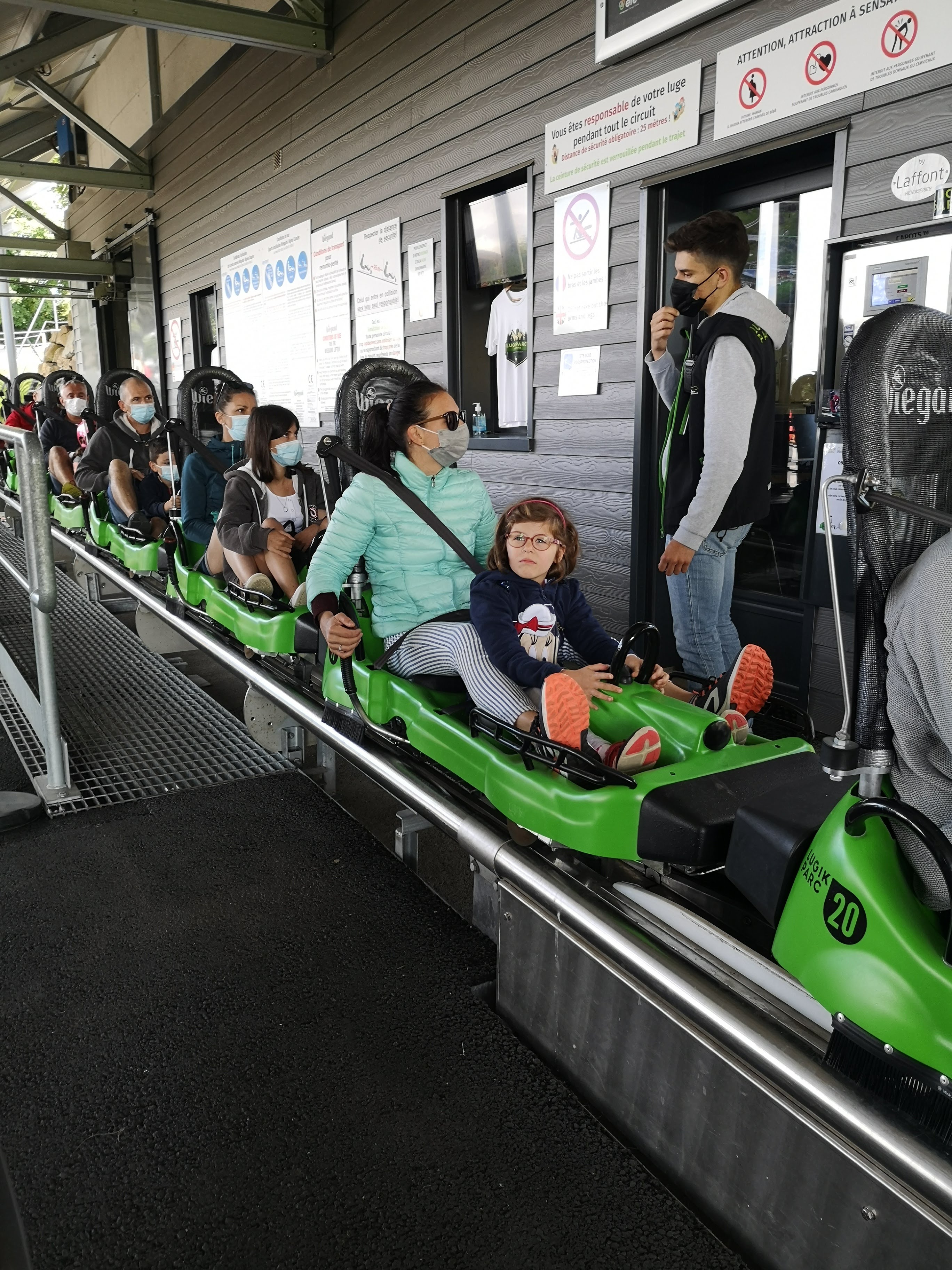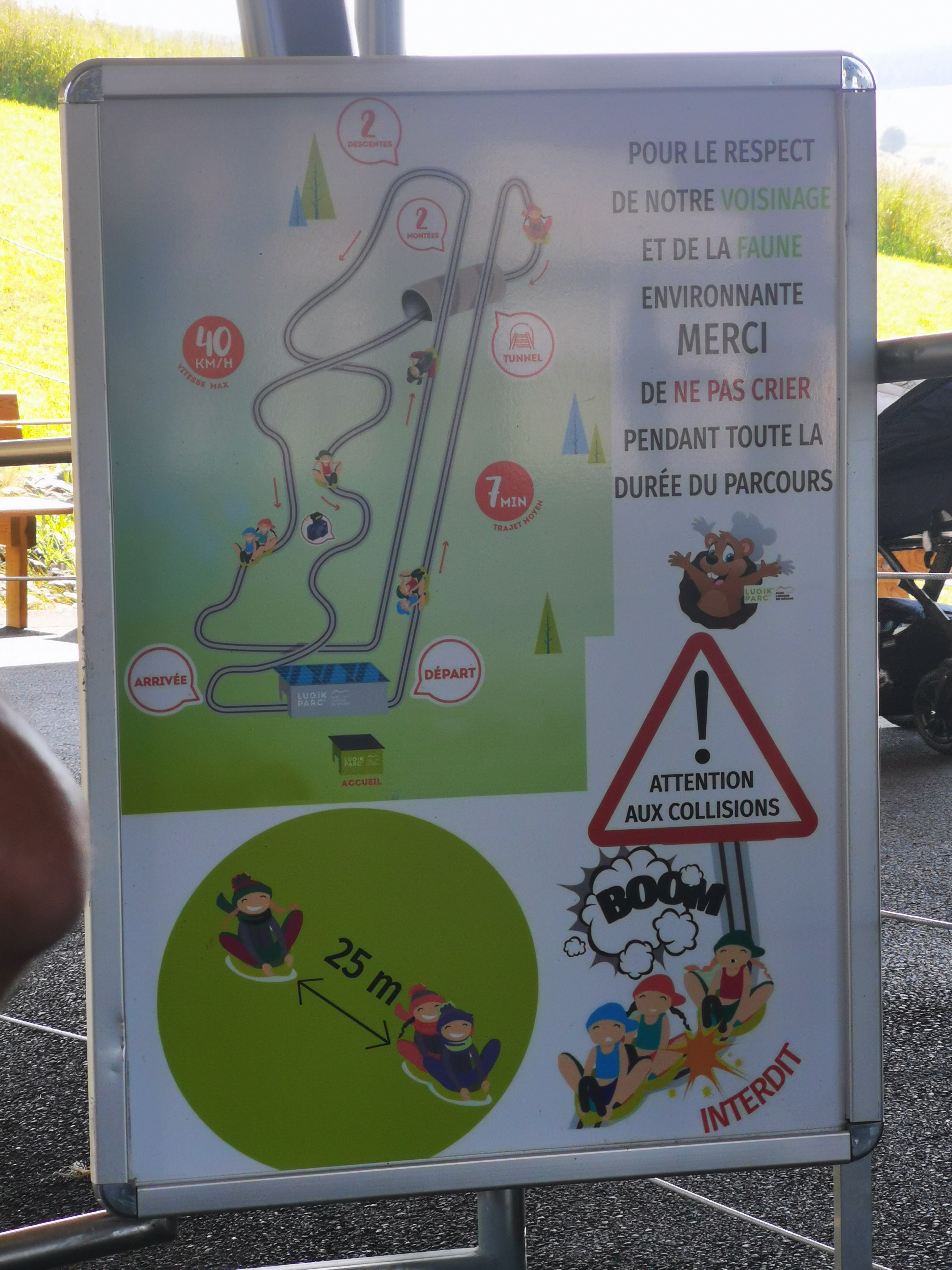 Sur la piste il y a un panneau « au feu vert pousser la manette » nous nous sommes fait disputer car nous avons suivi les panneaux. A l’arrivé idem, petit haussement de voix car nous avons mis du temps a sortir des luges . Mauvaise expérience.