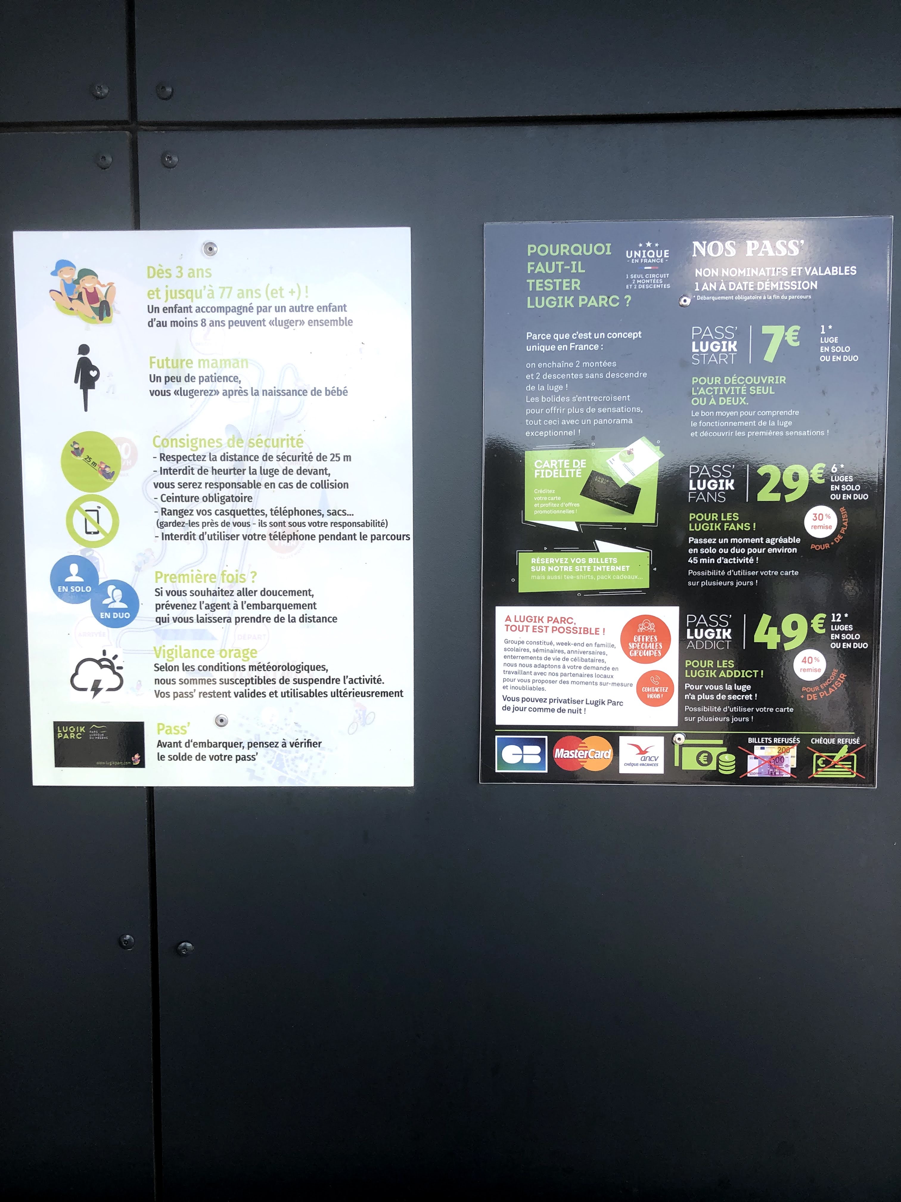 Nous sommes allés au lugik parc car nous avions gagnés 4 descentes sur un marché de Noël en 2023. La date limite été le 25 fevier 2024 (un peu court pour s'organiser une journée). Mon conjoint et notre fils de 3ans on bien aimé , sauf que pour la 1er descente ils sont restés bloqué (dans le froid) , et ensuite pour démarrer le 3ème tour la luge été en panne... Nous avons pas pu attendre qu'il repart !! Dommage les 2 derniers tours ont été à la poubelle .... Nous viendront au beaux jours , en espérant que cela se passe mieux que la 1ere fois ...